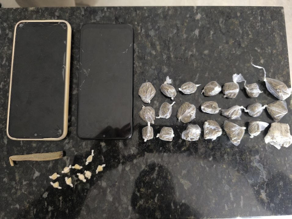 Durante a diligência, foram encontradas 21 trouxinhas de substância semelhante à maconha, já fracionadas e prontas para comercialização, além de 9 pedras de material aparentando ser crack. O material foi apreendido pelos policiais.